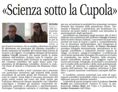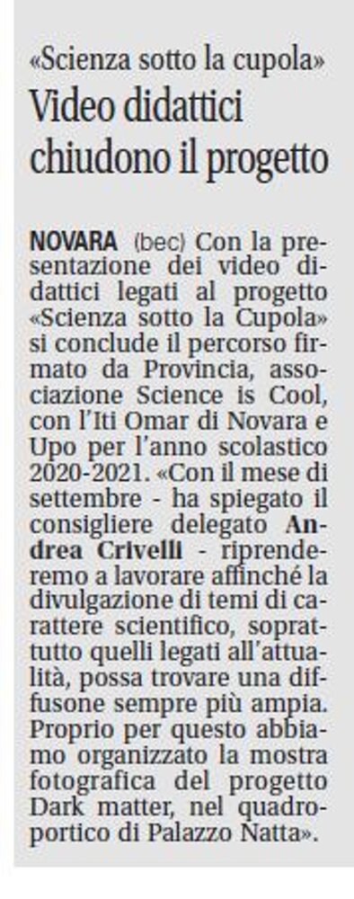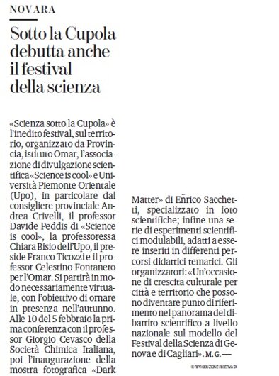 The Education Office of the Province of Novara in collaboration with the "Science is Cool" association of Rome have organized the "Scienza sotto la Cupola" festival for the school year 2020-2021.