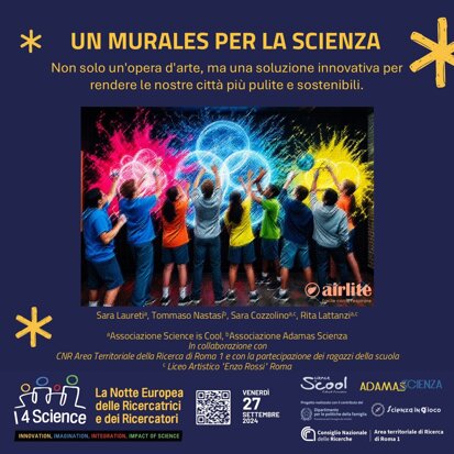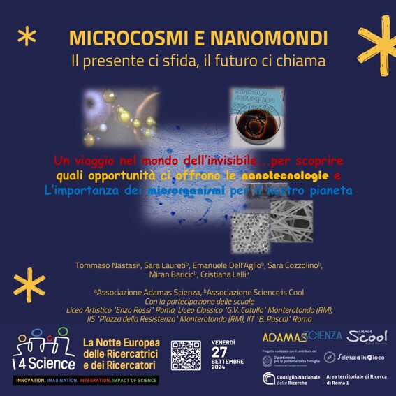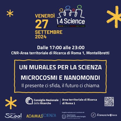 In questa occasione le iniziative "Un murales per la Scienza" e "MICROCOSMI E NANOMONDI - Il presente ci sfida, il futuro ci chiama" sono state ideate da Associazione Science is Cool e Associazione Adamas Scienza, con la partecipazione di studenti del Liceo Artistico "Enzo Rossi" Roma, Liceo Classico "G.V. Catullo" Monterotondo (RM), IIS "Piazza della Resistenza" Monterotondo (RM) e IIT "B. Pascal" Roma, in collaborazione con CNR Area Territoriale della Ricerca di Roma 1 e il contributo del Dipartimento per le politiche della famiglia – Presidenza del Consiglio dei ministri.