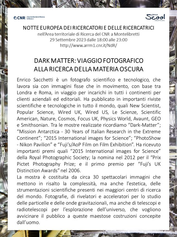 La mostra è stata realizzata con circa 30 spettacolari immagini che hanno messo in risalto la complessità, ma anche l’estetica, delle strumentazioni scientifiche presenti nei maggiori centri di ricerca del mondo. Fotografie, di rivelatori e acceleratori per lo studio delle particelle e delle onde gravitazionali, ma anche di telescopi e radiotelescopi per l’esplorazione dell’universo, che vogliono avvicinare il pubblico a queste maestose costruzioni concepite dall’uomo. Enrico Sacchetti è un fotografo scientifico e tecnologico, che lavora sia con immagini fisse che in movimento, con base tra Londra e Roma. Ha pubblicato in importanti riviste scientifiche e tecnologiche in tutto il mondo, quali New Scientist, Popular Science, Wired UK, Wired US, Le Scienze, Scientific American, Nature, Cosmos, Focus UK, Physics World, Avaunt, GEO e Smithsonian. Tra le mostre realizzate ricordiamo “Dark-Matter”; “Mission Antarctica - 30 Years of Italian Research in the Extreme Continent”; “2015 International images for Science”; “PhotoShow - Nikon Pavilion” e “Fuji’s/AoP Film on Film Exhibition”. Ha ricevuto importanti premi quali “2015 International images for Science” della Royal Photographic Society; la nomina nel 2012 per il “Prix Pictet Photography Prize; e il primo premio per “Fuji’s UK Distinction Awards” nel 2006.